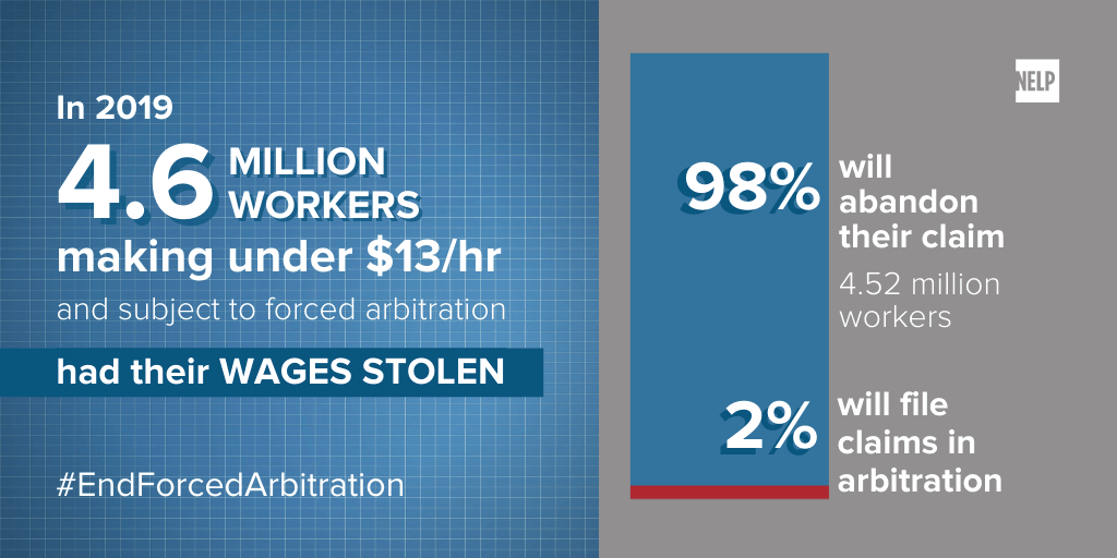 Corporations are increasingly imposing forced arbitration requirements on their workers as a condition of employment, denying them the right to go before a judge and jury when their employer steals their wages, such as by failing to pay the legally required minimum wage and overtime. Black workers (59.1%) and women workers (57.6%) are the most likely to have forced arbitration requirements imposed on them by their employers.